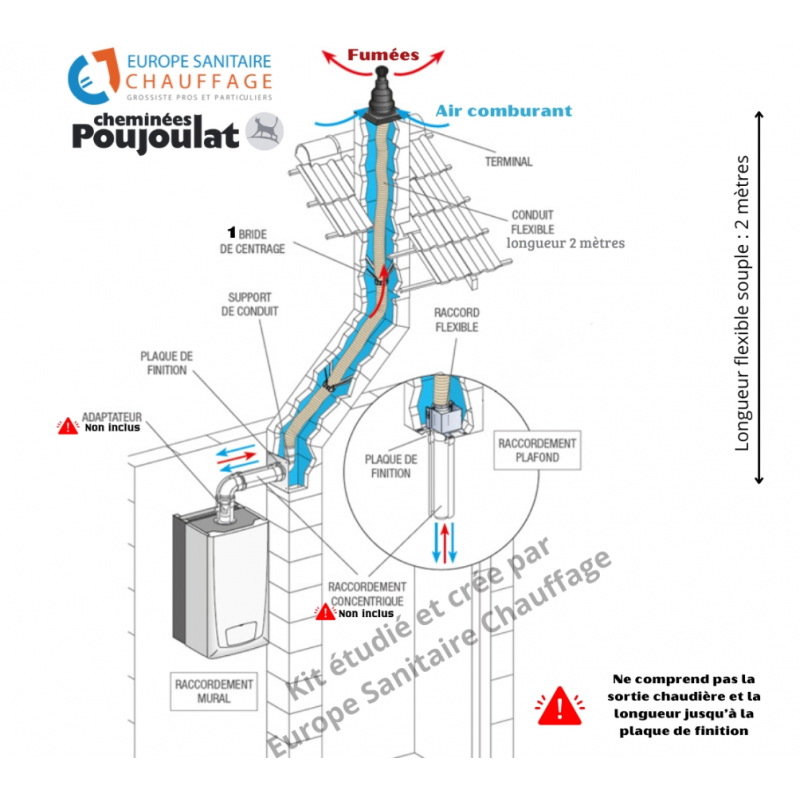 Flexcondens permet de réaliser des rénovations de conduits individuels dans plusieurs configurations d'amenée d'air comburant à la chaudière.Ce kit est utilisé lorsque la chaudière se situe dans le volume habitable et la ventilation de la maison est réalisée grâce à une VMC.