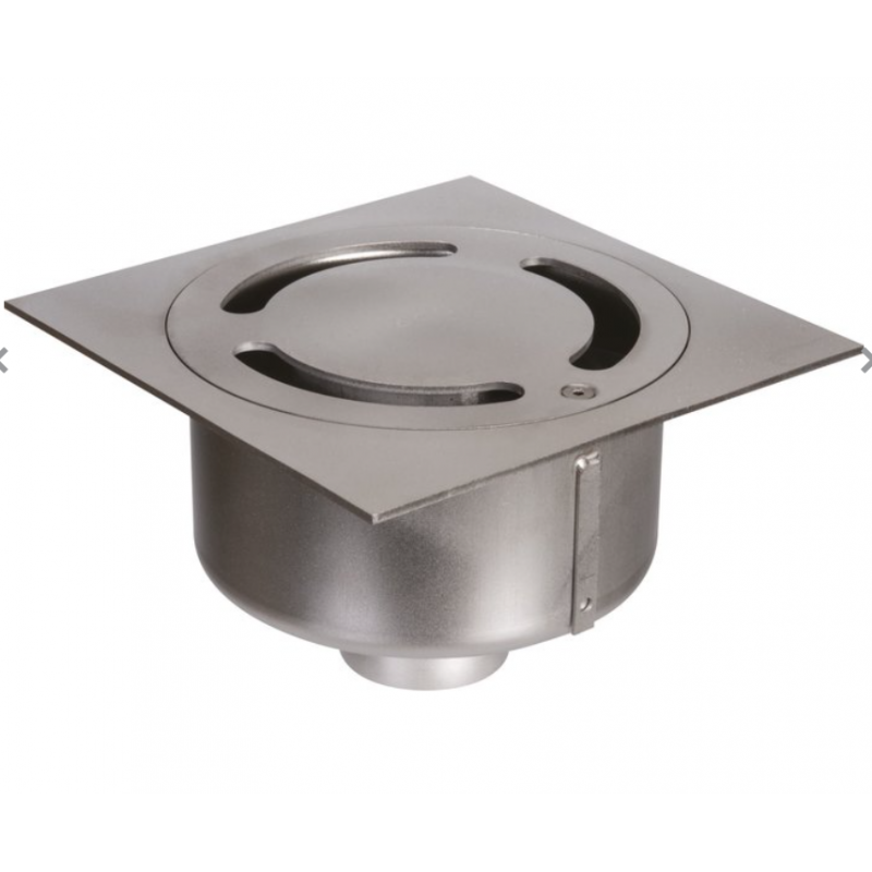 Siphinox Limatec en acier inox EN 1.4301 150 x150 mm avec prise de terre, télescopique, sortie verticale diamètre 50 mm. Ecoulement 0.65 l/s env., garde d'eau 50 mm. Platine de positionnement et d'étanchéité 325 x 325 mm. Rosette libre avec bombage central drainant et design à trois diamètres d'orifices 5 - 7 - 8 mm résistant à une charge répartie de 3.3 kN. Cloche désolidarisée.